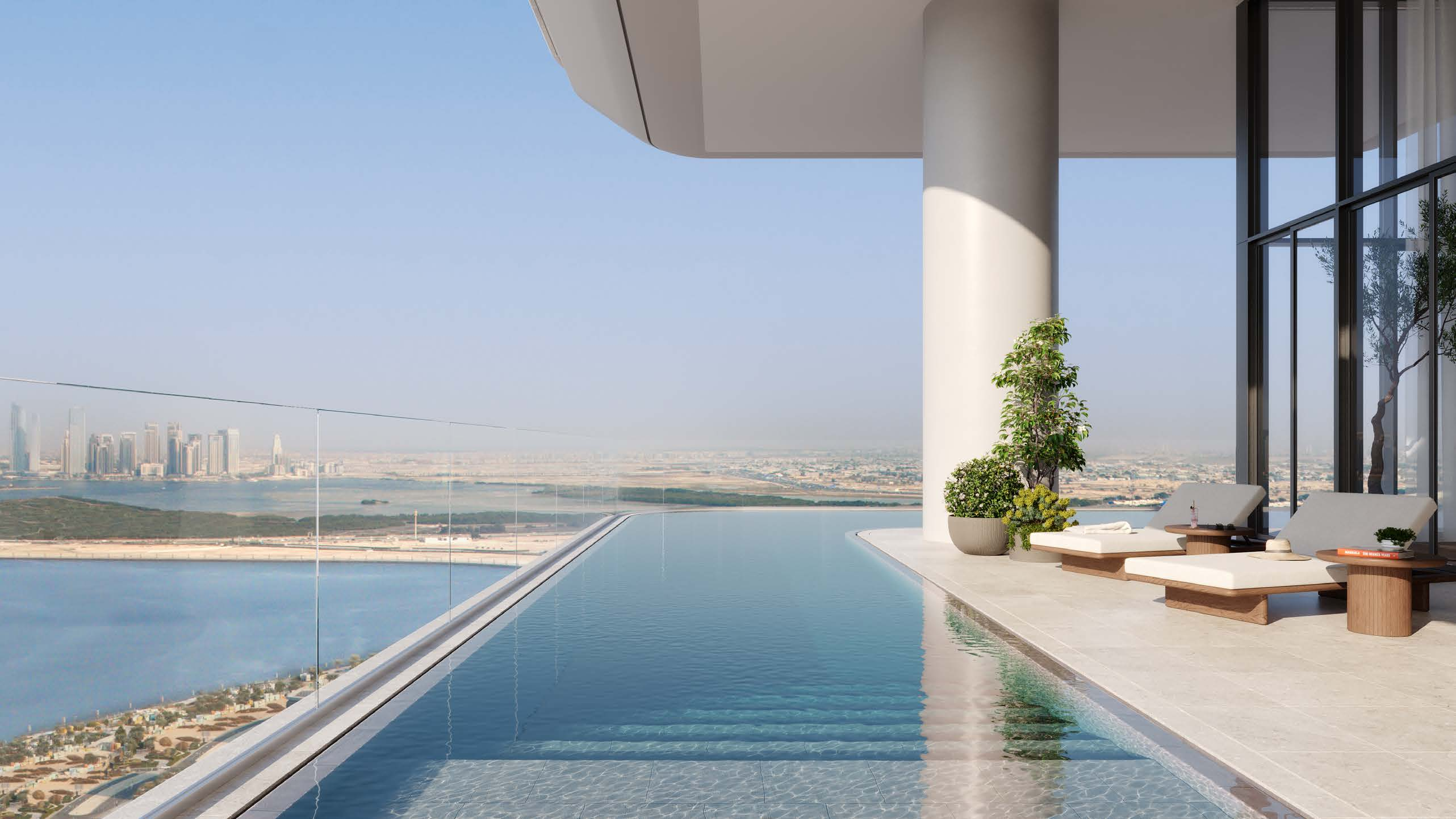 L型云端泳池: 复式及大户型单位配备迪拜独特的 L 型转角私人泳池,在天际线背景下畅游,实现室内外无界衔接。