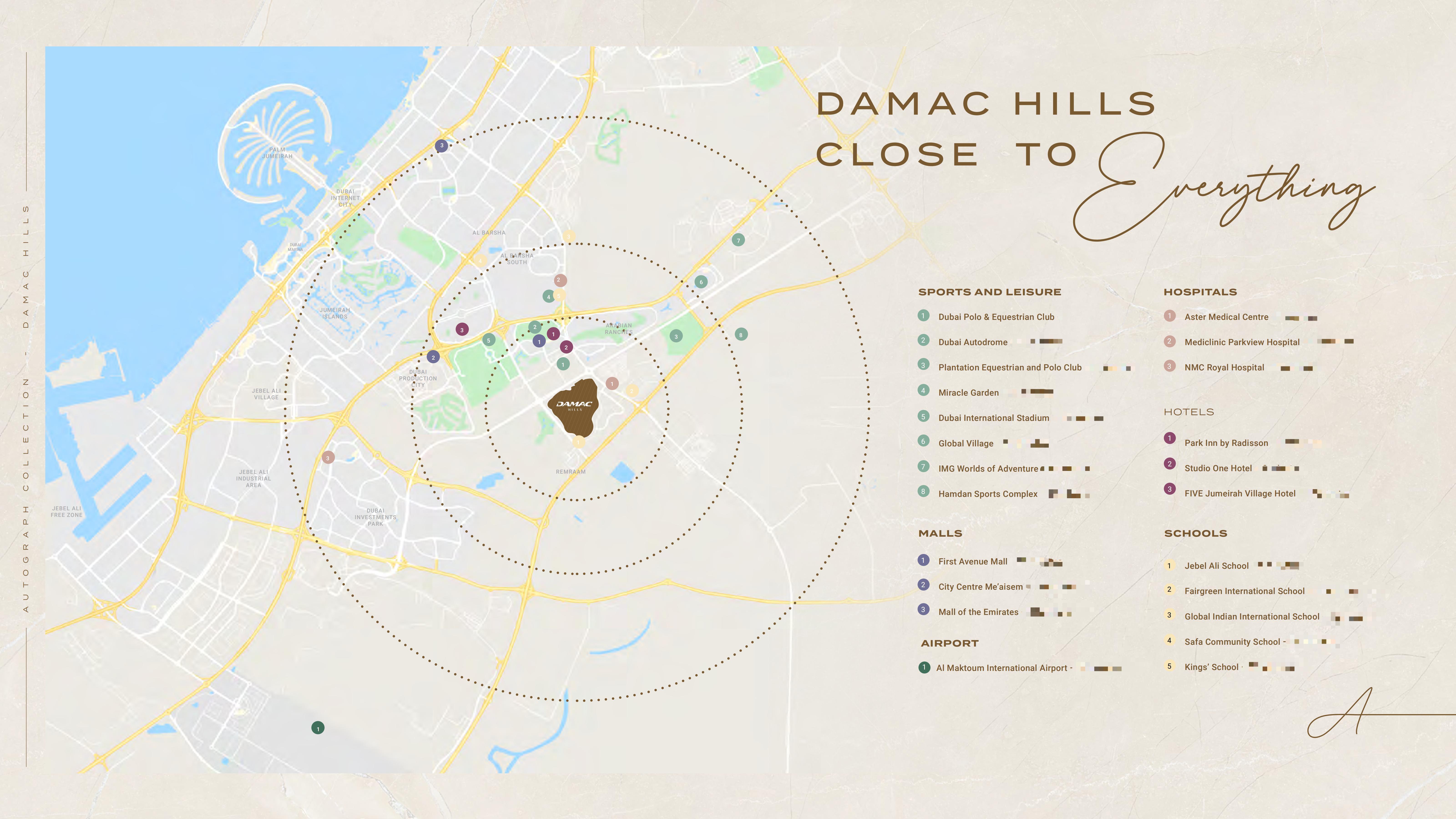 社区内配备篮球场、足球场、网球场、板球场、排球场、烧烤区、儿童游乐区、迷你高尔夫、溜冰场、马厩、慢跑跑道、滑板公园、中央公园、野餐公园、水果公园、水上乐园、喷泉、钓鱼湖、马里布湾 wave 池、宠物农场、高尔夫球场、活动区、板式网球场、12辆美食卡车、Carrefour 超市、Spinneys 超市、Bakericious 超市、Viva Supermarket 超市、Corner Barber 理发店、4Her Salon 沙龙、Community Centre 社区中心、Radisson Dubai DAMAC Hills 酒店、Trump International Golf Club 高尔夫俱乐部等;周边临近 First Avenue Mall、City Centre Me’aisem、Mall of the Emirates 等商场,生活所需触手可及。