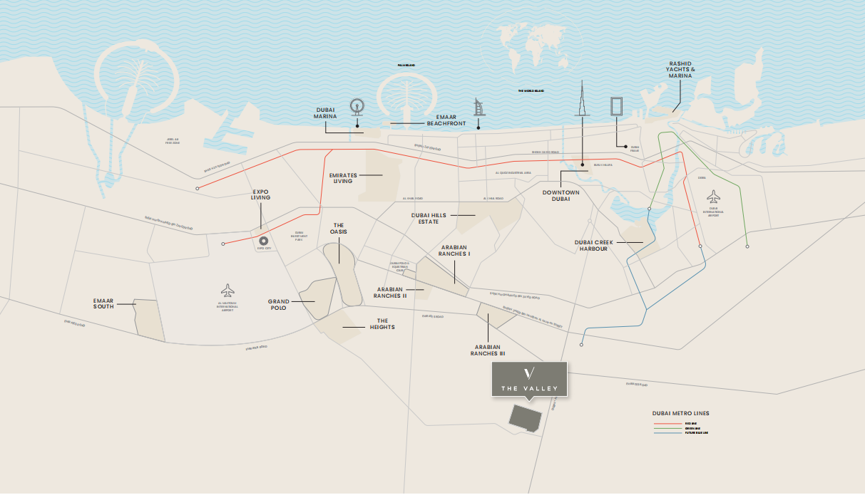 临近Jebel Ali Lahbab Road,衔接Sheikh Zayed Road与Emirates Road,可直达迪拜市中心(Downtown Dubai)、杰贝阿里(Jebel Ali)、杰贝阿里自由区(JAFZA)、迪拜南部(Dubai South)、迪拜投资园(DIP)、2020世博会场地等核心区域及迪拜国际机场,路网通达便捷。![]()