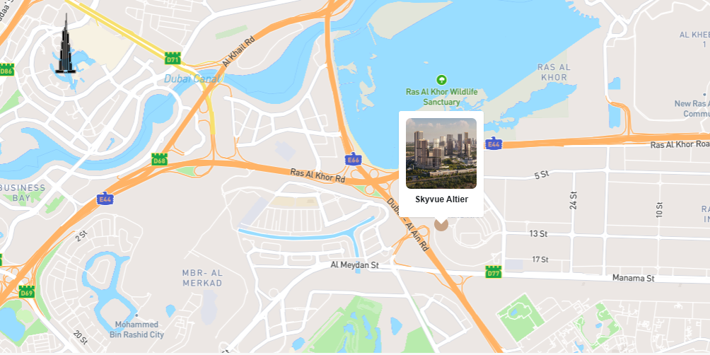 项目位于 Sobha Hartland II(Bu Kadra,Nad Al Sheba 1),周边以城市主干道网络为主要出行方式,日常可通过自驾或出租车高效连接迪拜多个重点功能区域。项目邻近 Ras Al Khor Road(E44)、Al Ain Road(E66) 等城市快速通道,出行方向选择灵活。
