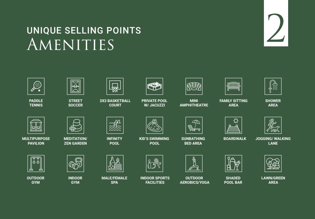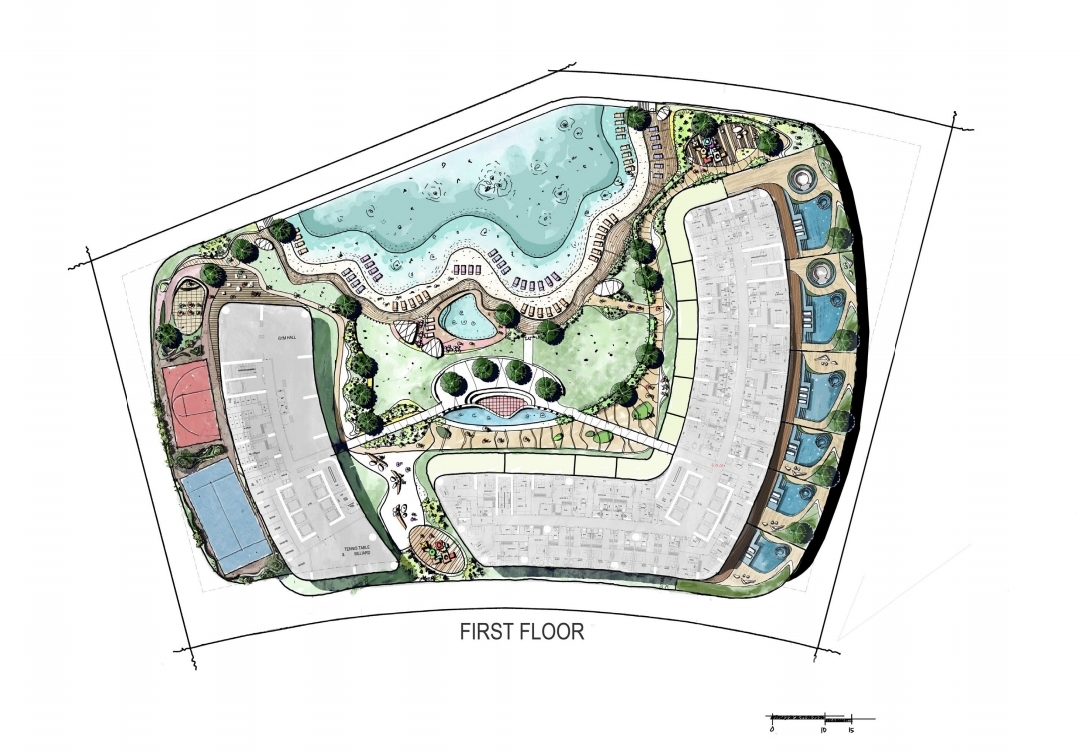 各种球场,无边泳池,儿童泳池,按摩浴缸,家庭休息区,多功能馆,空中花园,日光浴区,跑步专用道,室外健身器材,室内健身房,男/女桑拿房,室外瑜伽/冥想花园,泳池酒吧等。![]()