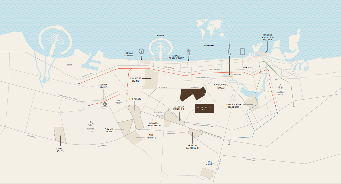 周边拥有Dubai Hills Mall、Dubai Hills Park、Dubai Hills Golf Course等设施。